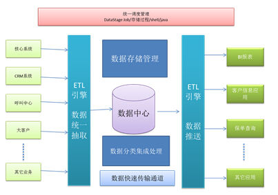 问题同样出现在使用DataStage作为其ETL工具的友邦保险,友邦保险之前的数据交换主要集中在业务系统到数据中心的数据加工处理,以及业务系统与BI系统间的数据传输和交换。但随着ETL作业所涉及的业务种类的增加,ETL作业量开始迅速增长,系统间的数据交换关系也越来越复杂。首先,ETL作业较多,统一管理困难,其次,ETL服务器需要集中为统一的资源池,共同负载ETL作业,ETL作业需要动态均衡地分配到各ETL服务器上,服务器的资源管理存在一定难度,此外还需要专门针对DataStage作业进行调度,应用接口复杂。