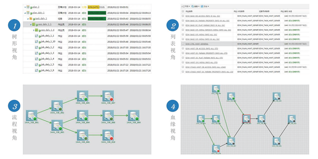 对于银行机构而言,当一个全行级的统一调度平台建设完成,通常会被移交给运维部门,并要求统一调度平台具备全方位的监控能力及便捷高效的运维手段,可以对调度运行状况进行全方位监控(包括调度各个层级的监控、所有调度作业的监控、调度流程的监控以及血缘视角的监控等),以节省运维部门在人力、物力上的投入。调度全方位监控如图3所示。