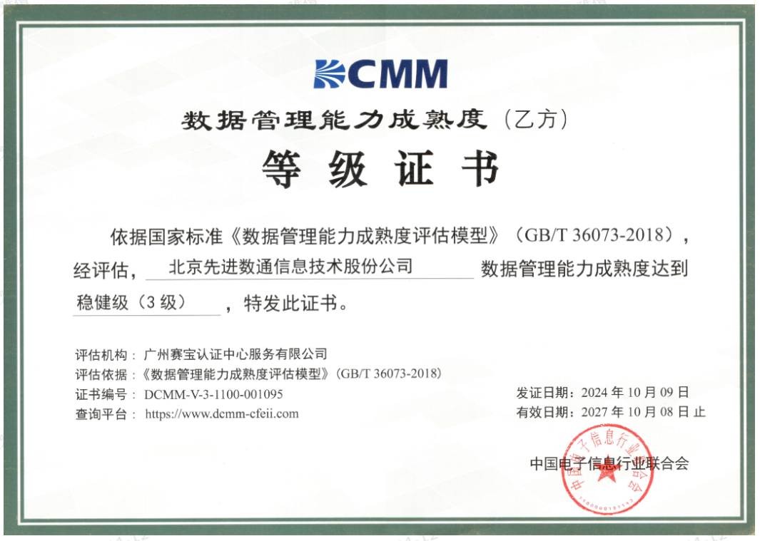 近日,中国电子信息行业联合会公布了最新一批通过数据管理能力成熟度(DCMM)贯标等级认证的企业名单。乐鱼官网数通成功获得数据管理能力成熟度稳健级(三级)认证。这一认证的获得,标志着乐鱼官网数通在数据治理体系构建和数据管理与应用能力方面,已经达到了国家权威机构认可的标准。这不仅是对乐鱼官网数通在数据管理领域专业能力的肯定,也是对其在推动数字化转型服务和数据驱动决策方面所做努力的认可。