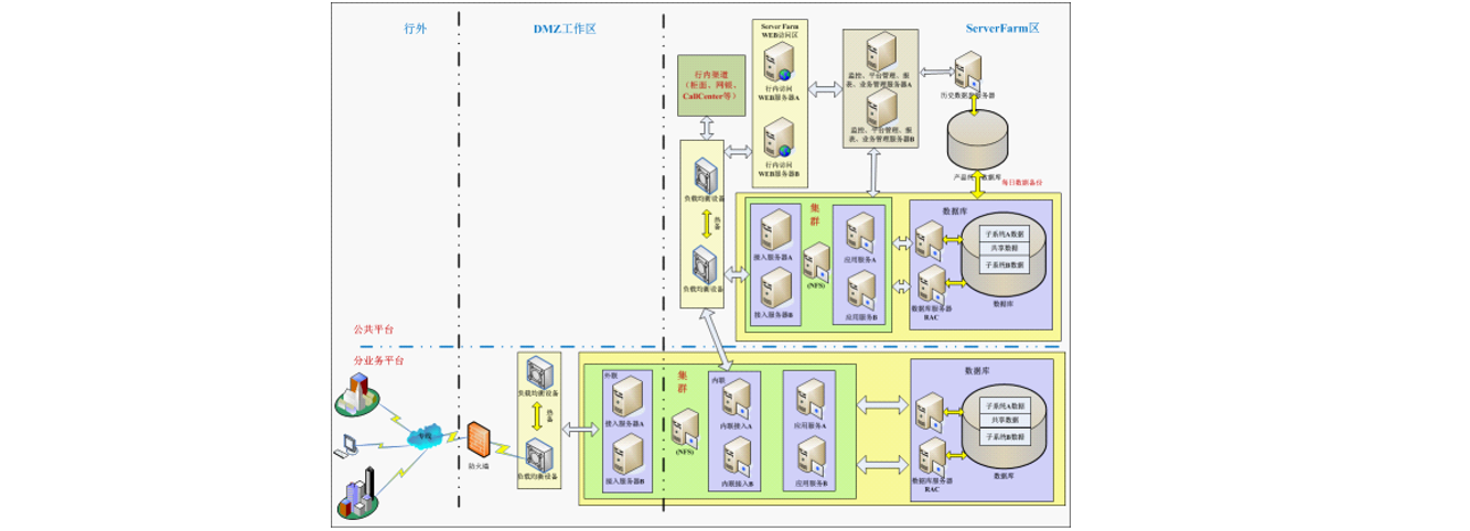 系统为二级部署,总业务平台与行内其它服务系统,行内渠道系统通过负载均衡设备实现集群部署和访问,而总平台和分业务平台之间业务是通过负载均衡设备实现集群部署和访问,实现业务量增长的横向扩展。