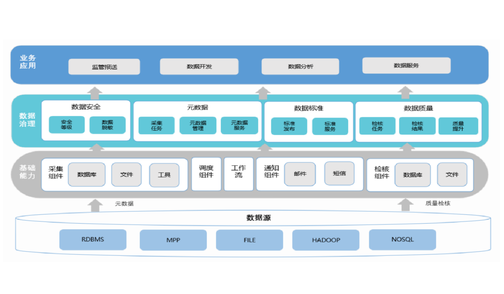 - 数据质量管理以发现数据问题、数据问题分析、解决数据问题为主线,提供数据检核引擎、检核规则配置、检核任务监控、检核结果查询与数据质量报告等功能,形成从数据质量问题发现,到数据质量问题提出与数据质量问题解决的数据质量提升闭环,帮助企业不断提高数据质量、发掘数据价值